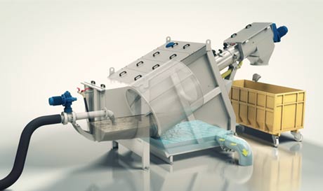 Both screen basket and dewatering zone are self-cleaning. Rotating around its axis, the cylindrical filter conveys the screenings into a loading hopper placed in the centre. A set of spray nozzles washes the filter during operation. A screw, placed inside the conveying pipe, with its top inside the discharge hopper, conveys the screenings towards the following treatment stages during which organic substances are washed out. Subsequently, solids are compacted and dewatered in the compacting and drainage area. Finally, solids are discharged through a discharge chute.